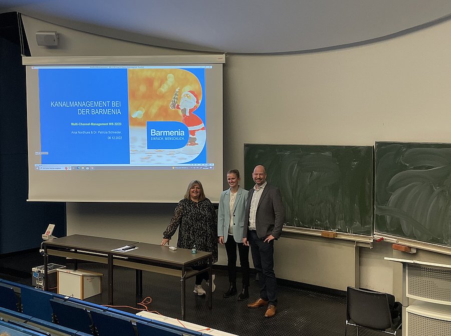 Am Dienstag, den 06.12.2022, hielten Frau Anja Nordhues, Hauptabteilungsleiterin Vertriebsmanagement der Barmenia Versicherungen, und Frau Dr. Patricia J. Schneider, Abteilungsleiterin Vertriebssteuerung der Barmenia Versicherungen, einen Vortrag im Rahmen des Moduls Multi-Channel-Management. Der Titel des Vortrags lautete "Kanalmanagement bei der Barmenia". Im Anschluss an den Vortrag erfolgte eine rege Diskussion mit den Studierenden.